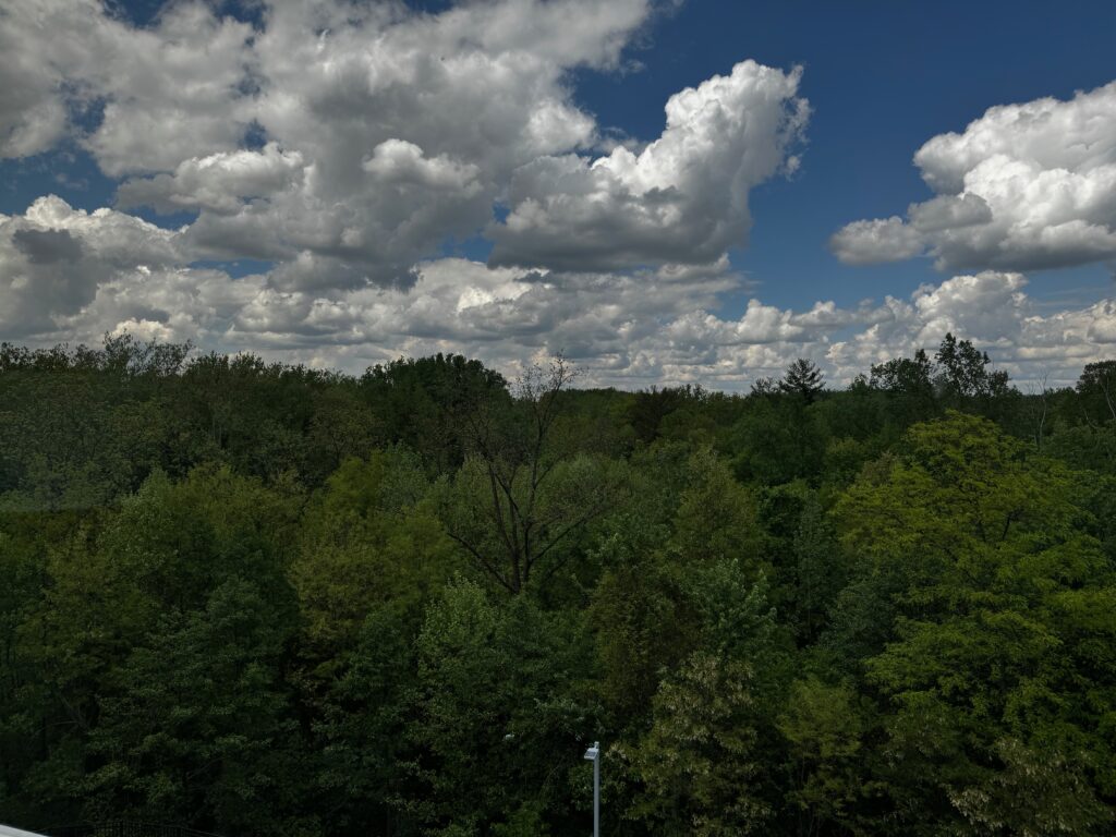 Finally, the view out my hotel room window is so much nicer today than it was yesterday with the rain and low, dark clouds. I find this very relaxing; other than a bit of parking lot directly below the window, this is all I see.