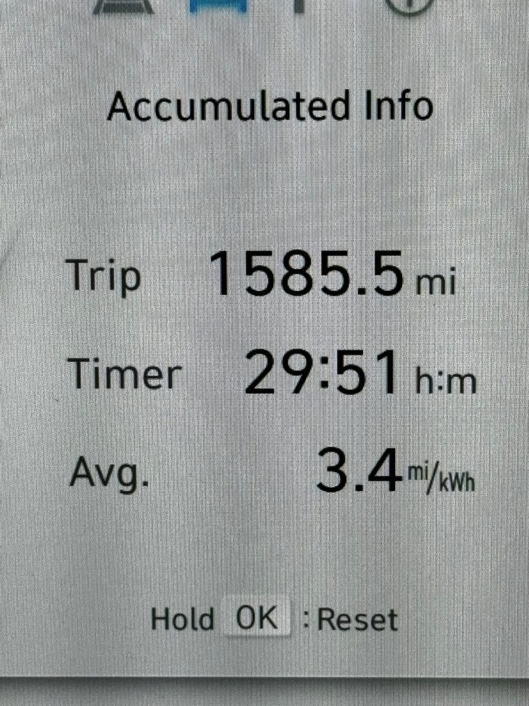 Today was the last day of this trip, 325 miles from Rochester NY to home in MA. The afternoon became quite windy so the car ended up averaging 3.4 miles/kWh for the overall trip rather than the 3.5 I’d been hoping for.