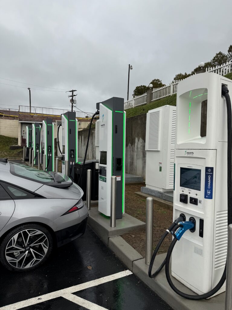 As I entered Harrisburg, I found fog and rain, light at first but gradually turning heavier. It didn’t let up once I was on I-76, the Pennsylvania Turnpike (which eventually joined I-70) and I was in and out of heavy traffic in this fog and rain for what seemed like hours. Fortunately, the rain let up by the time I stopped in Bedford PA for my first charge of the day at a Sheetz gas station that had 6 Electrify America chargers (still free to me).