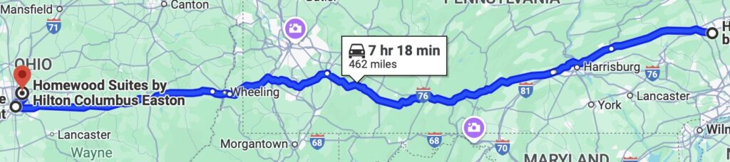 I left my hotel in Allentown at sunrise, heading west on I-78 to I-81 to I-76/I-70. My plan was simple — drive for a little over an hour and stop at the rest area on I-81 north of Harrisburg PA. Simple … except that the rest area building was closed for some reason (there was no sign, just workers inside miming that they weren’t open). OK, so much for that idea … good thing I didn’t overdo the coffee intake this morning!