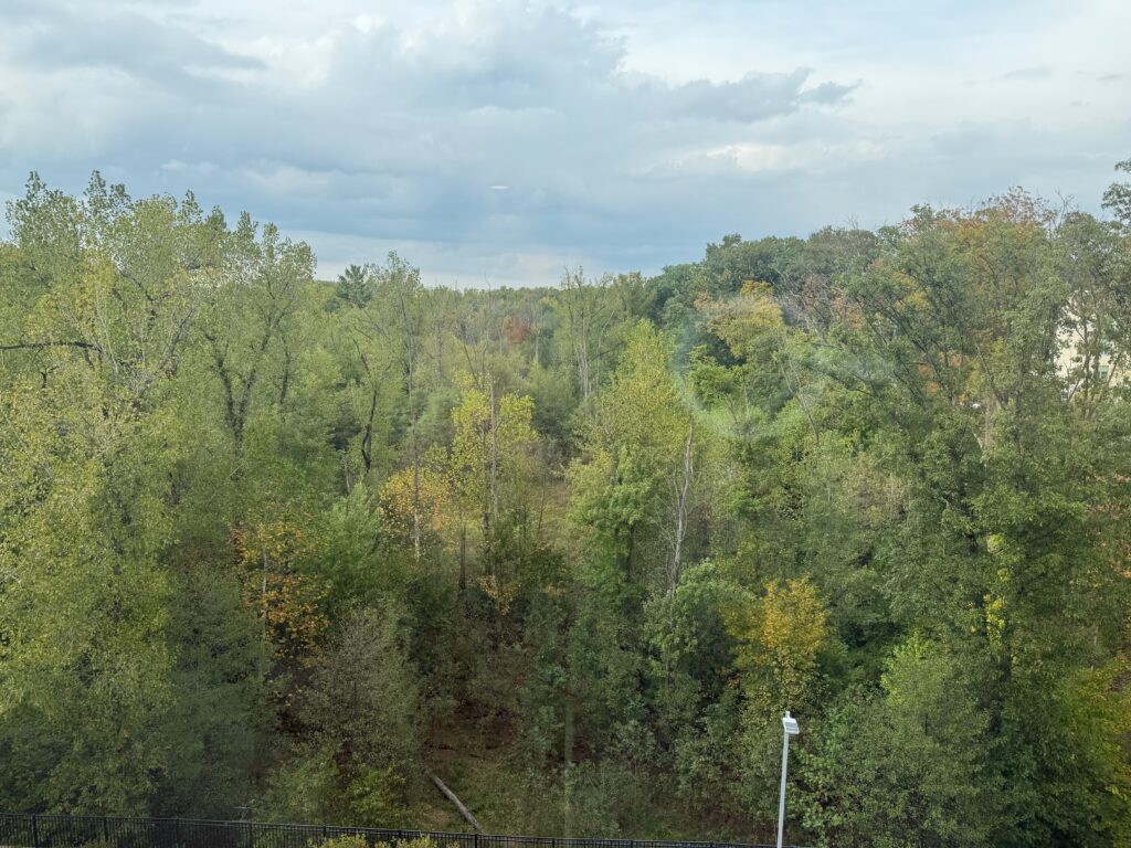 I didn’t get out much while I was in Columbus the last two days; it rained on and off and the sky was constant, low, dark gray clouds. This was the view out my hotel room window yesterday afternoon when it seemed the sun might win out after all (it didn’t!):