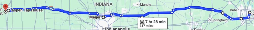 This morning was more of the same, only quite dismal, and I drove with my headlights on for a couple of hours until the sky began to lighten. Just as I crossed into Indiana, blue skies came into view and stayed with me the rest of the day. There was also a large Red Tail Hawk perched next to the road to welcome me to a new state!