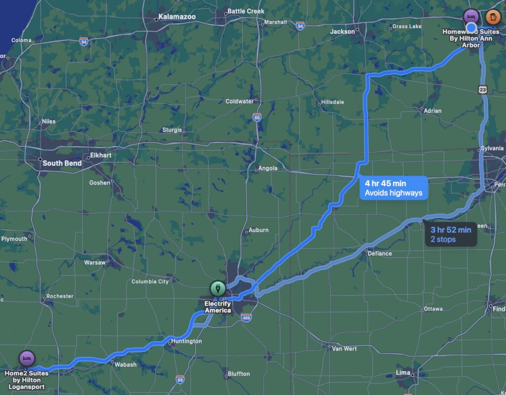 Still on the backroads, first from my hotel in Logansport IN where I couldn’t charge my car to an Electrify America near Fort Wayne, then to Arbor Brewing Company in Ypsilanti MI, and finally a few more miles to my hotel in Ann Arbor. My route was the dark blue line on the map: