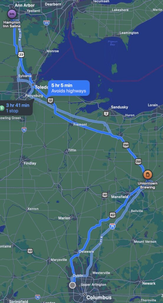 I woke up to constant moderate rain this morning but it had mostly ended by the time I left at 9:30am I did drive through some areas of rain through the first half of the day, but it was mostly light unlike yesterday’s downpours! Today was just 215 miles on back roads to Ashland OH and then to Hilliard OH where I’m staying for the next three nights. It wasn’t a direct route because it involved a stop at a great brewpub I’d discovered last March, Uniontown Brewing.