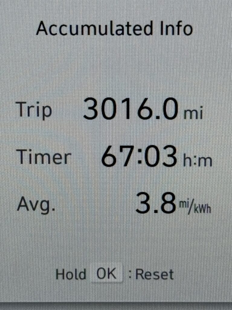 My efficiency on the three legs of today’s trip was 3.6 miles/kWh, 3.5, and 3.4, respectively, leaving me with exactly 3.5 miles/kWh for the day. With the entire day spent on interstates at 71-73 mph and through hilly terrain, I’m quite happy with that! My overall trip efficiency dropped one tenth to 3.8, leaving me hopeful that I’ll end up at 3.7 after tomorrow’s drive. Here’s where I am right now, and I have just over 300 miles to drive tomorrow: