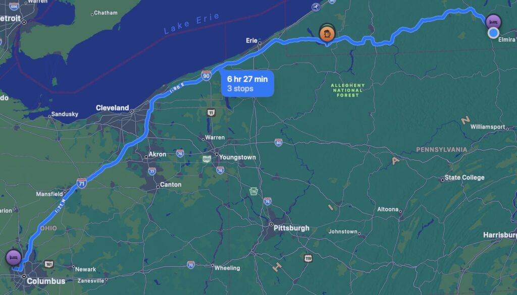 Today was the second longest driving day of the trip, beat only by the first day exactly two weeks ago. I drove 423 miles from Hilliard OH to Painted Post NY.