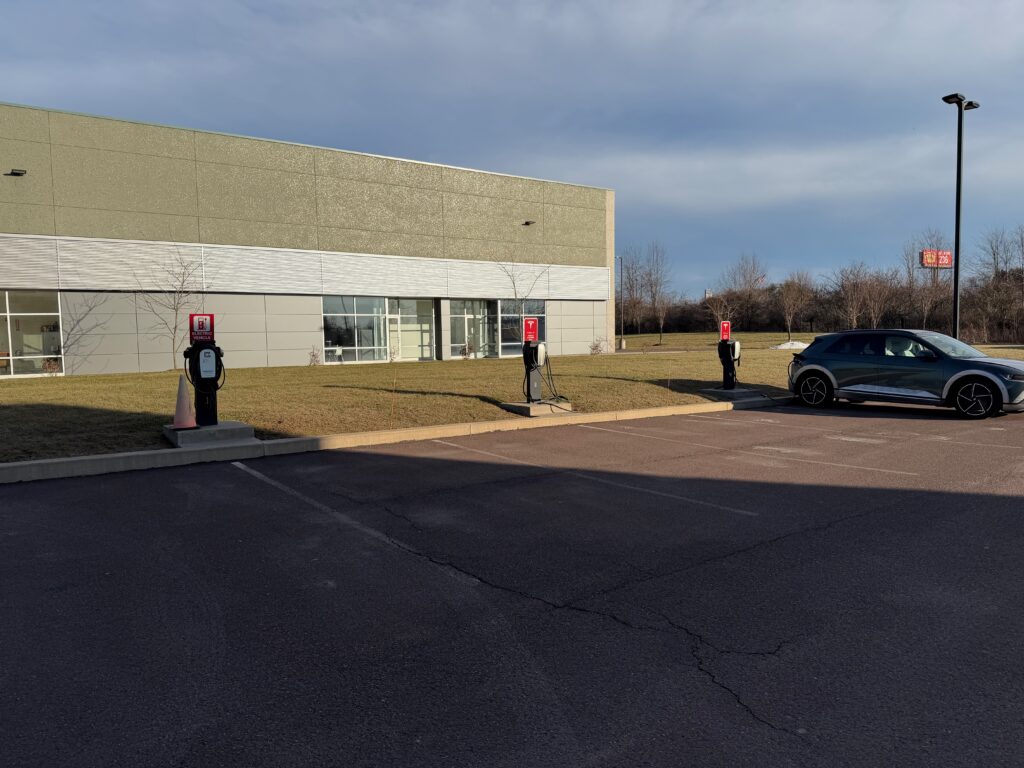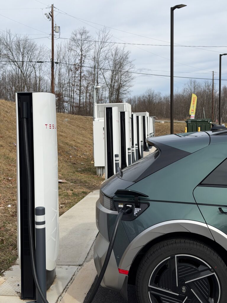 Church ran long and I didn’t leave there until almost 11:30, heading west on I-84 to its end at I-81 in Scranton. Just after crossing into Pennsylvania, I made my first charging stop at a Tesla Supercharger in Matamoras PA that I’ve been to before. As I’ve seen in the past, there was only one other car at this 16-charger station. I was really pleased to find that the new battery platform for Hyundai is much more efficient at stepping up the Tesla 400V current to the 800V required by the car — 124kW vs. 96kW speed that I had in the previous car! And that rate is very flat right up to 75% charge when it only drops off by 8-10%. I charged from 31-80% in 22.5 minutes, taking on 44.7kWh.