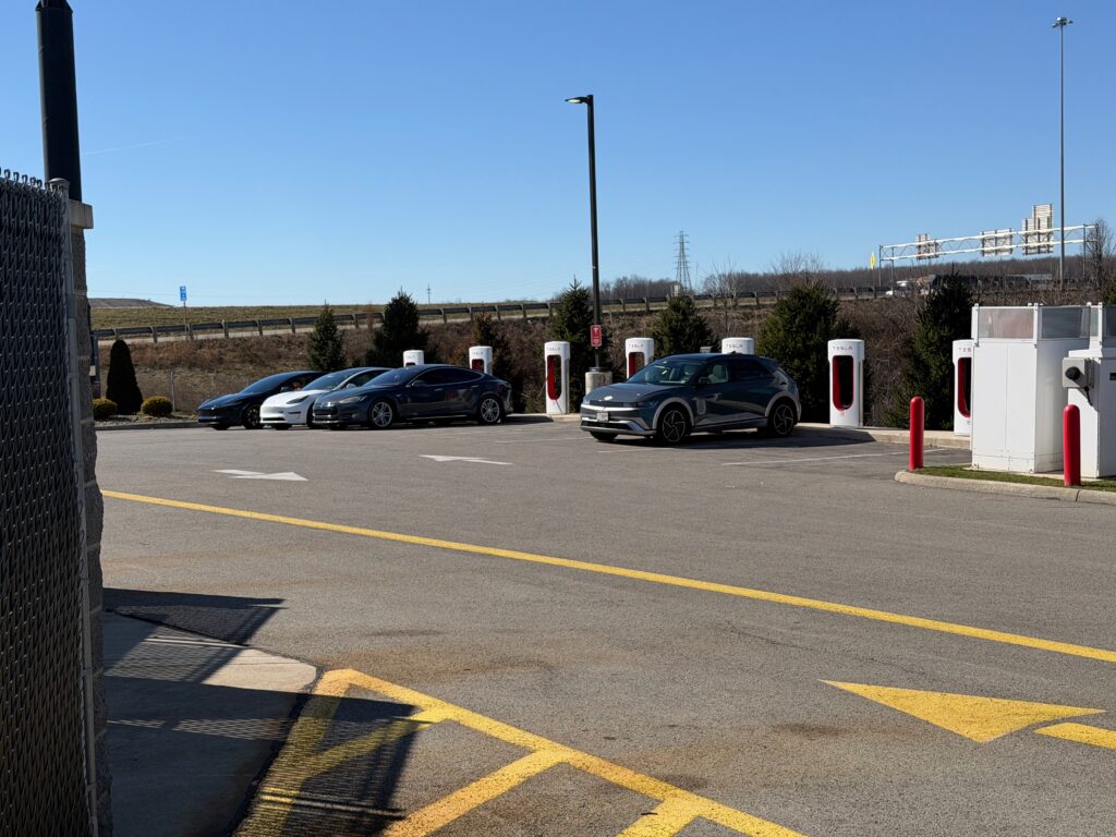It was 32º when I left the hotel this morning with 100% charge in the car and within an hour I was back into those lovely headwinds. After a couple of hours, I was in Clearfield PA, the temp was up to the mid-40s, and I stopped at a Tesla Supercharger location I was at last year in a Burger King parking lot. There were 10 V3 chargers here and I had them all to myself, getting 126 kW again for 47-90% in 25 minutes.