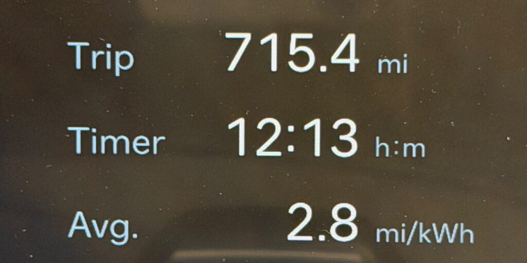 Today’s was 430 miles starting at 32º and ending at 69º with strong winds the entire time. Because of the winds, I was happy with the 2.8 miles/kWh which happens to be the average for the full trip so far. For the next few days, I’ll be local in Columbus so probably won’t post again until Thursday. Then I’m headed back home Friday and Saturday, probably in colder weather again, but hopefully with tailwinds that direction!